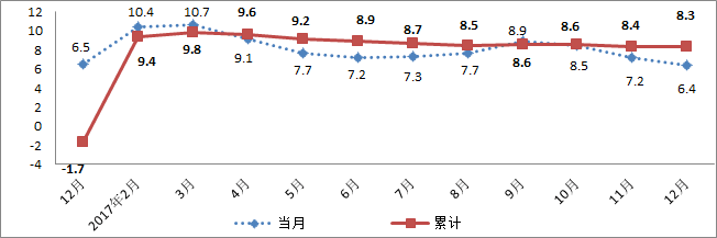 随着供给侧结构性改革推进,市场回暖,原材料行业呈现恢复性增长,原材料及上游产品价格快速上扬,带动工业品价格整体回升。2017年,湖北工业品购进价格同比上涨8.3%,出厂价格(PPI)同比上涨5.6%。
