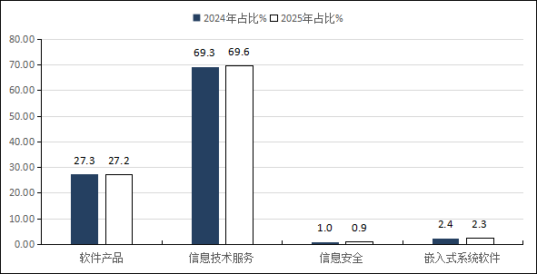信息技术服务收入1251.69亿元,同比增长16.5%,在全行业收入中占比为69.6%;信息安全收入16.08亿元,同比增长10.1%;嵌入式系统软件收入41.82亿元,同比增长10.7%。