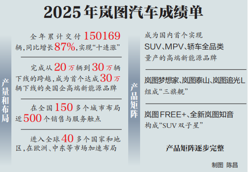 2025年,岚图汽车全年累计交付150169辆,同比增长87%,连年攀升,展现强劲发展势头;完成了从20万辆到30万辆下线的跨越,成为首个达成30万辆下线的央国企高端新能源品牌。2025年,岚图汽车实现“十连涨”,也是在“十四五”收官之年交出的一份量质并进的成绩单。