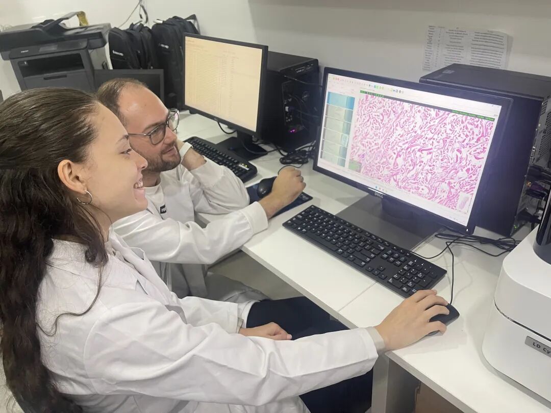 巴西的实验室技术员查看通过兰丁数字病理产品扫描出的组织样本片。