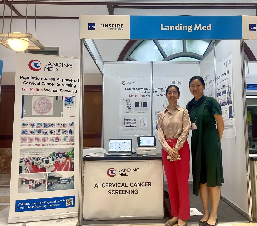 兰丁国际市场总监汪兰(右)在亚洲开发银行(ADB)首届亚太卫生体系大会上展示兰丁AI产品及技术。