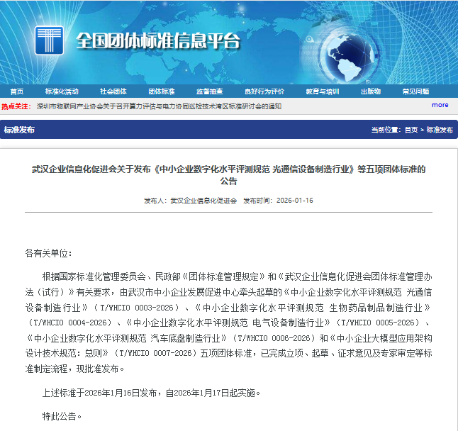 近日,武汉市中小企业发展促进中心牵头起草的五项团体标准已正式发布。光通信设备制造、生物药品制品制造、电气设备制造、汽车底盘制造四个重点行业的中小企业,未来进行数字化水平评测将有“标”可依。同时,一项面向中小企业大模型应用的通用技术规范也一同发布。