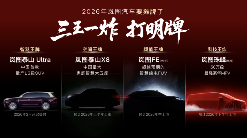 岚图汽车董事长、党委书记卢放表示,岚图新年开局产销两旺得益于用户对品牌与产品的认可。2026年,岚图计划推出四款搭载L3级智能辅助驾驶硬件的新产品,覆盖SUV、FUV及MPV三大品类,持续扩容产品矩阵。其中,作为中国首款量产L3级SUV的岚图泰山Ultra,搭载华为乾崑智驾ADS 4四激光解决方案,预计将于今年3月开启交付。