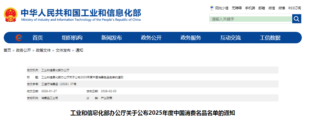为深入贯彻党的二十大和二十届历次全会精神,加快落实全国新型工业化推进大会工作部署,贯彻实施中办、国办《提振消费专项行动方案》,根据《工业和信息化部办公厅关于组织征集2025年度中国消费名品的通知》(工信厅消费函〔2025〕378号),经企业申报、省级工业和信息化主管部门初审推荐、专家评审和网上公示,工业和信息化部确定了2025年度中国消费名品名单,现予以公布。