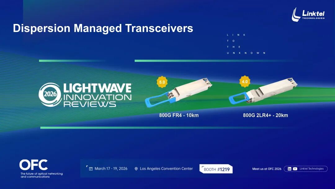 此外,联特科技还展出自主研发的800G OSFP FR4 10km与800G OSFP 2LR4+ 20km色散管理光模块,产品分别在2026年度Lightwave光通信创新大奖评选中获5.0分和4.0分的高分评价。