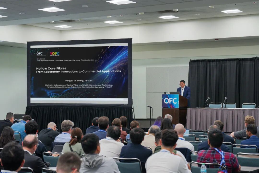 大会期间,多场学术会议同期举行。长飞光纤作为全球最大的光纤预制棒、光纤和光缆供应商,发表20多篇论文,创历史新高。集团技术总监罗杰分享道,公司在去年OFC发布的0.05dB/km全球最低光纤衰减纪录基础上,进一步降低至0.04dB/km。目前,长飞空芯光纤已在亚洲、欧洲多地部署商用及试点项目。
