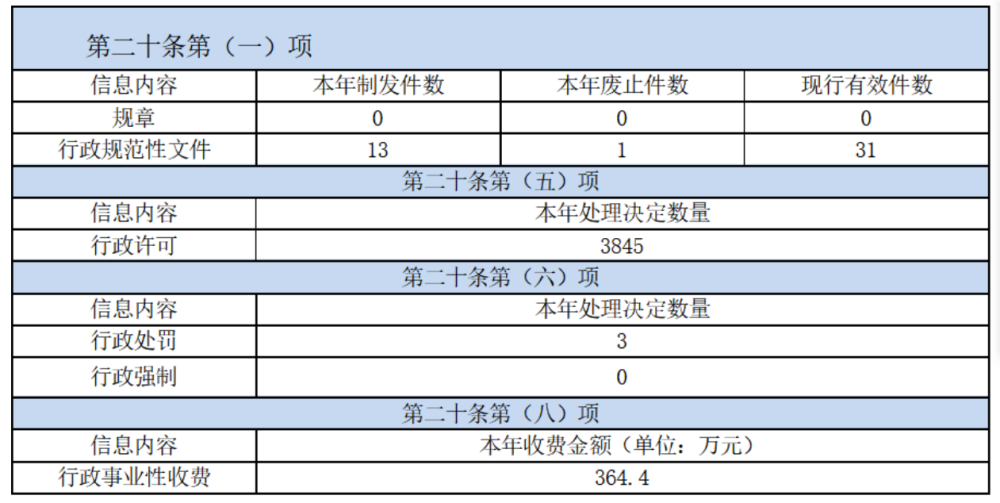 全年共制发规范性文件13件;行政许可受理数量3845件,行政处罚数量3件;行政事业性收费364.4万元。