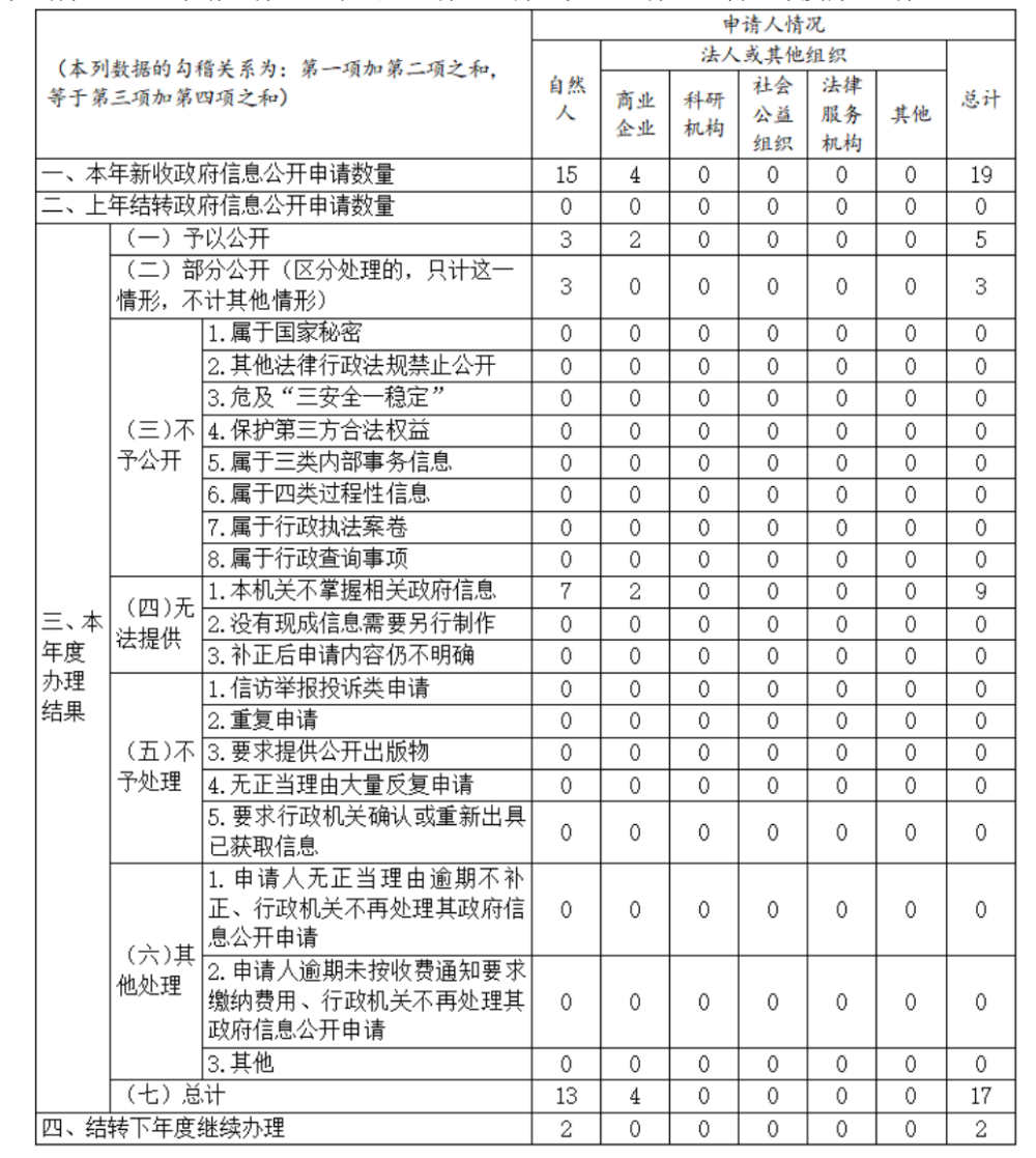 2025年,全厅共收到政府信息公开申请19件(其中线上18件),办理完成17件,结转下年度办理2件。