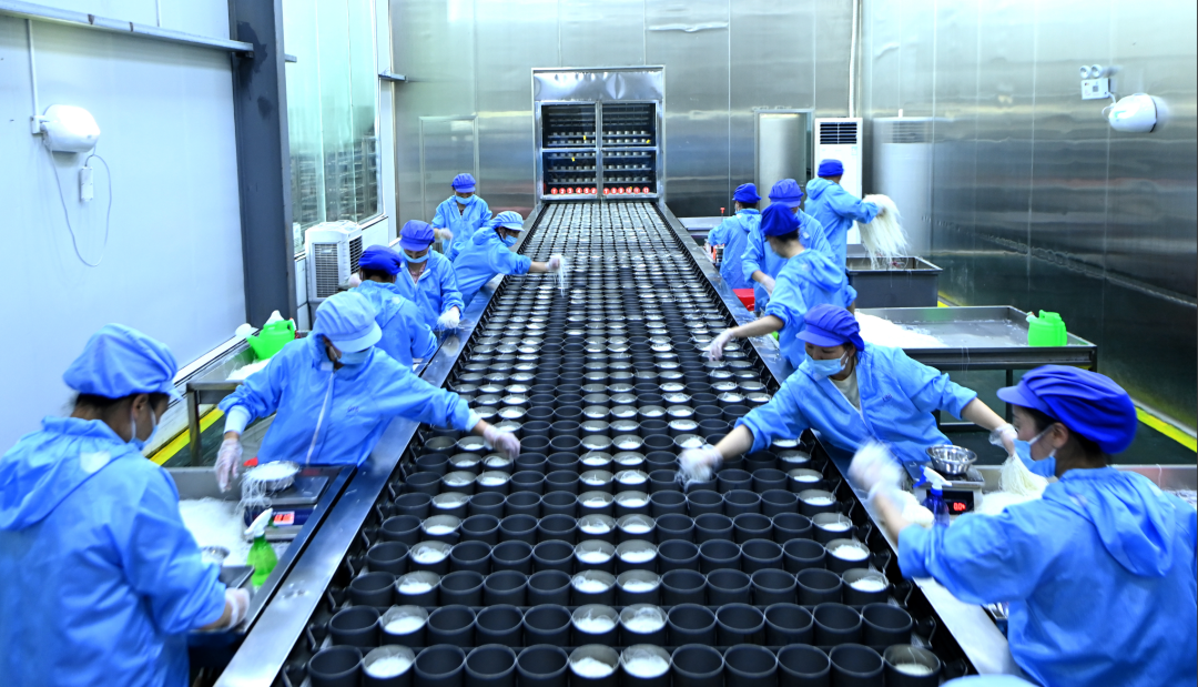 安陆市李店工业园楚丰泉源农业股份有限公司生产车间,工人在正在加工生产米粉。(李文勇摄)